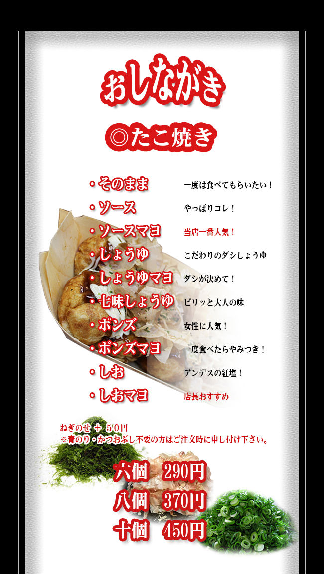 負けません!大手にこの味は!!と大将自慢のたこ焼きを是非味わって下さい。